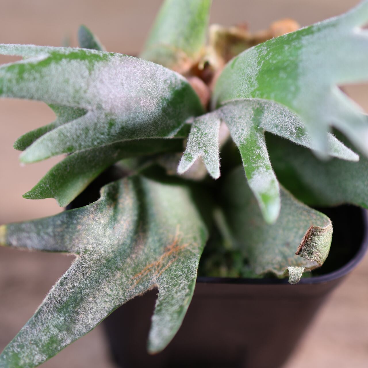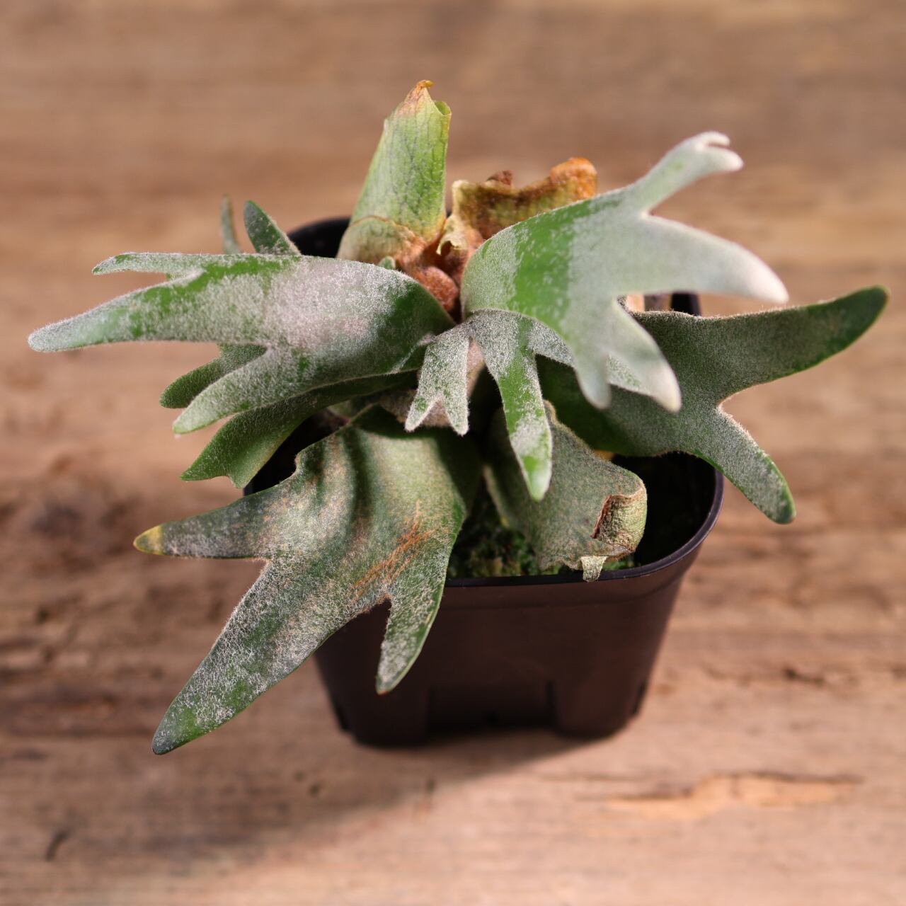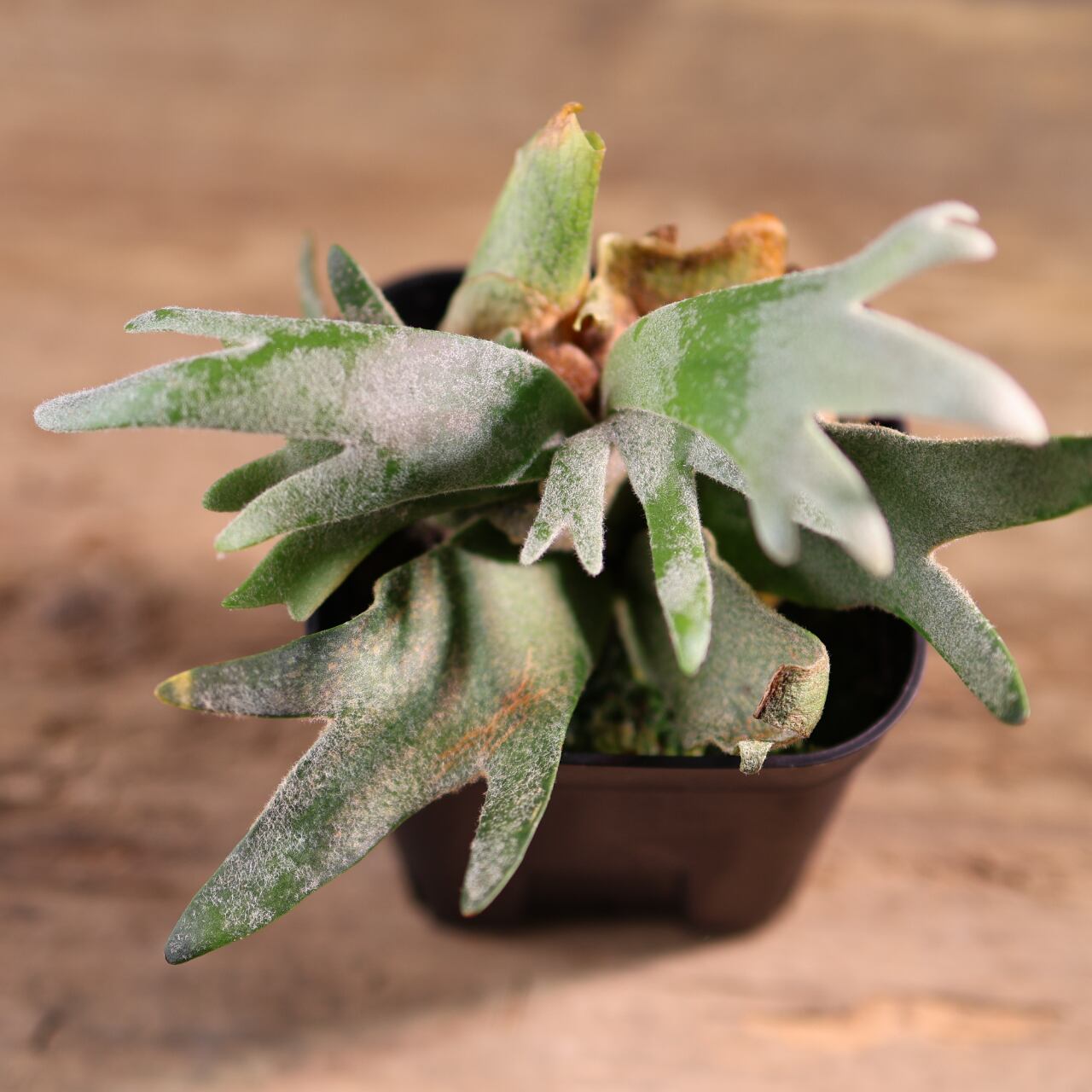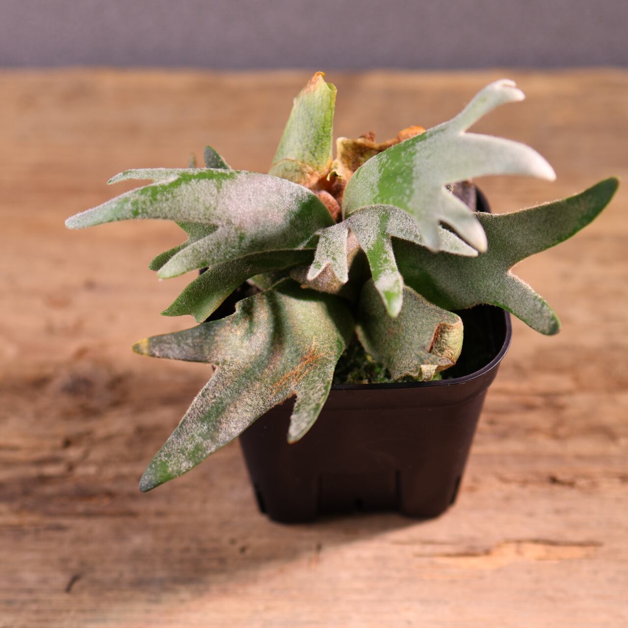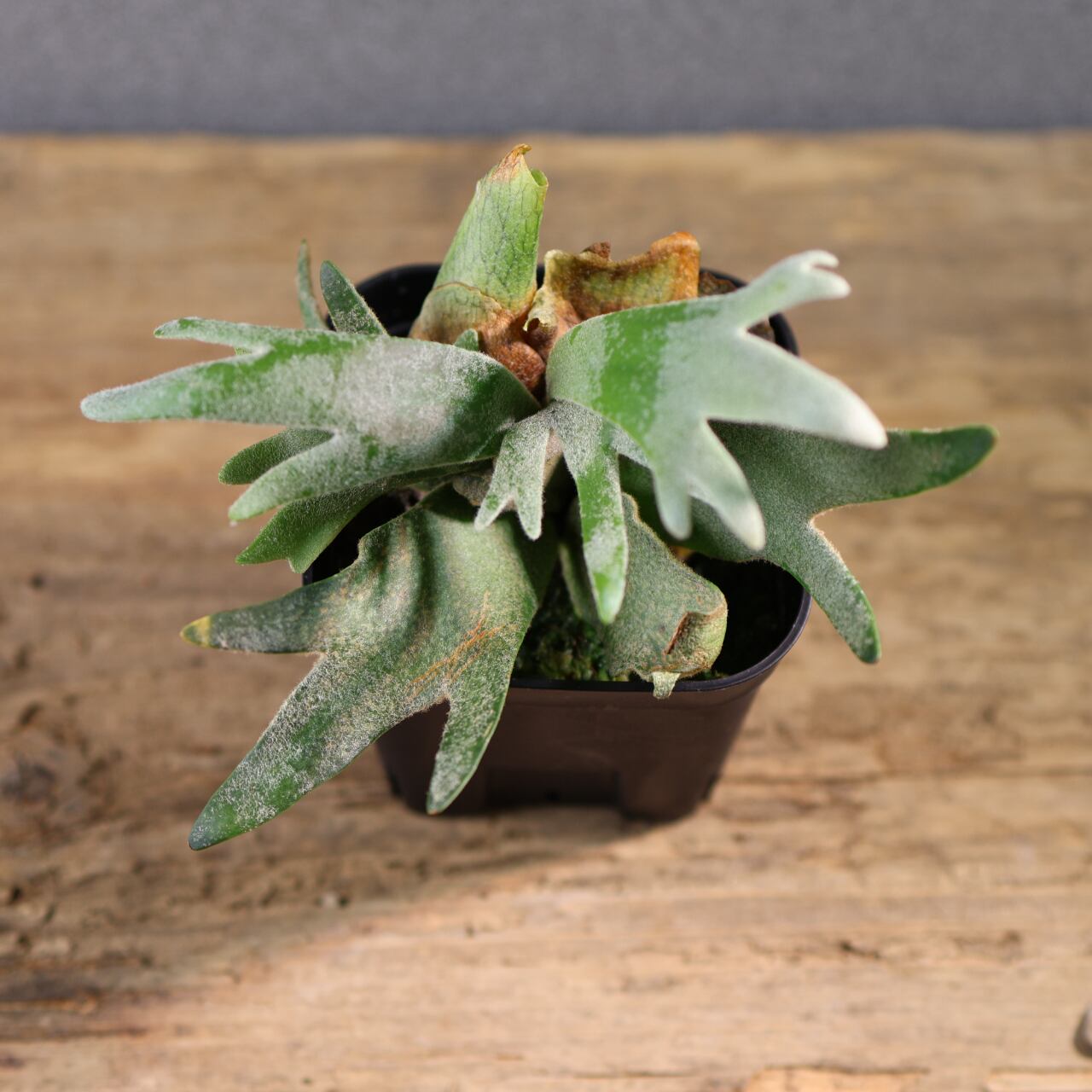 ジェイドガールは、丸みのある肉厚な葉と、やわらかく白みを帯びたグリーンが魅力のビカクシダの園芸品種です。