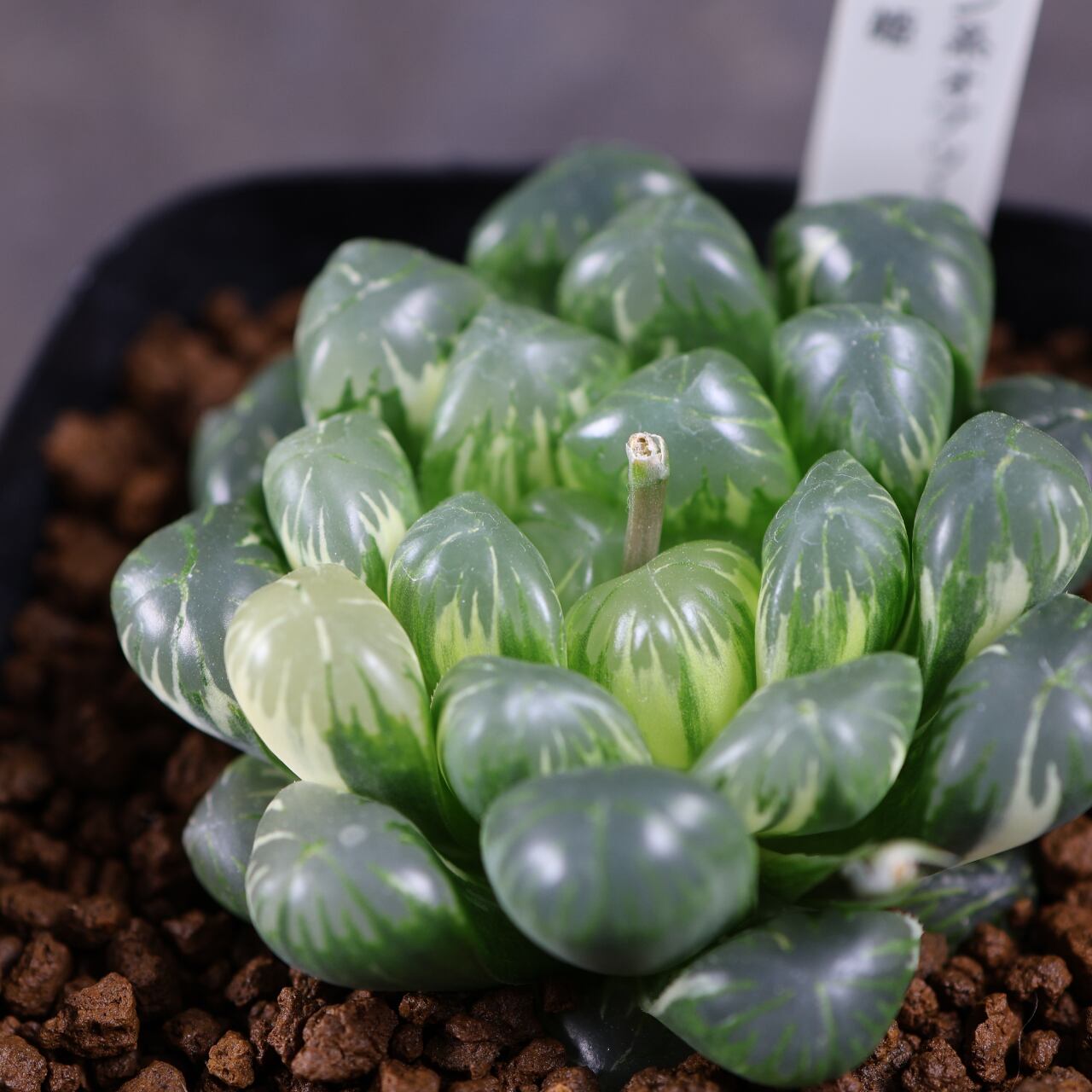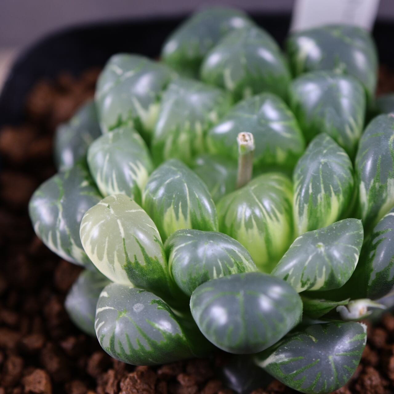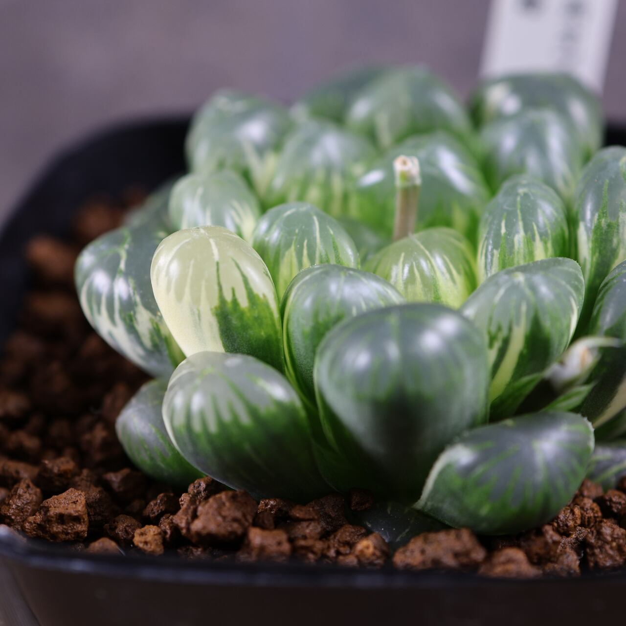 透明感のある葉で人気のHaworthiaオブツーサの中でも、ドドソン系に由来する丸みと厚みのある葉を持つ選抜系統。そこに美しい斑が入ることで、より華やかな印象に仕上がっています。