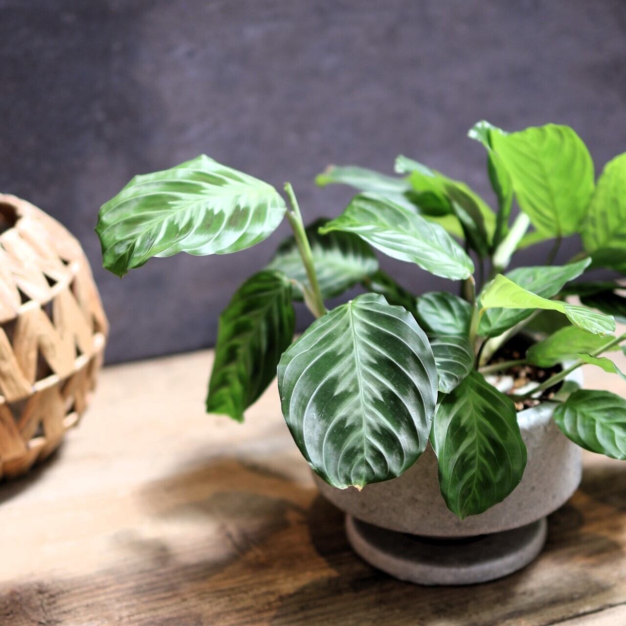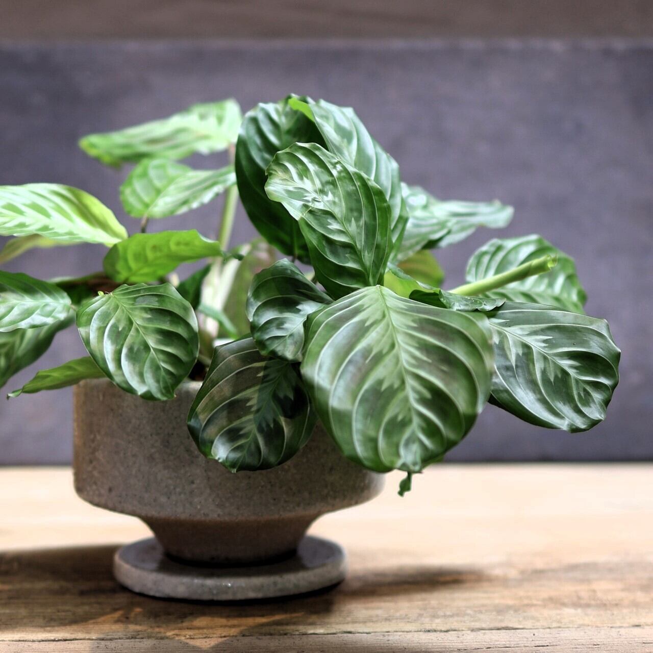 マランタ属の植物は、日が暮れると葉を閉じ、朝になると再び開く「祈りの草」としても知られており、この植物もその動きを楽しむことができます。コンパクトで育てやすく、リビングやデスクの上に置いて楽しむことができます。