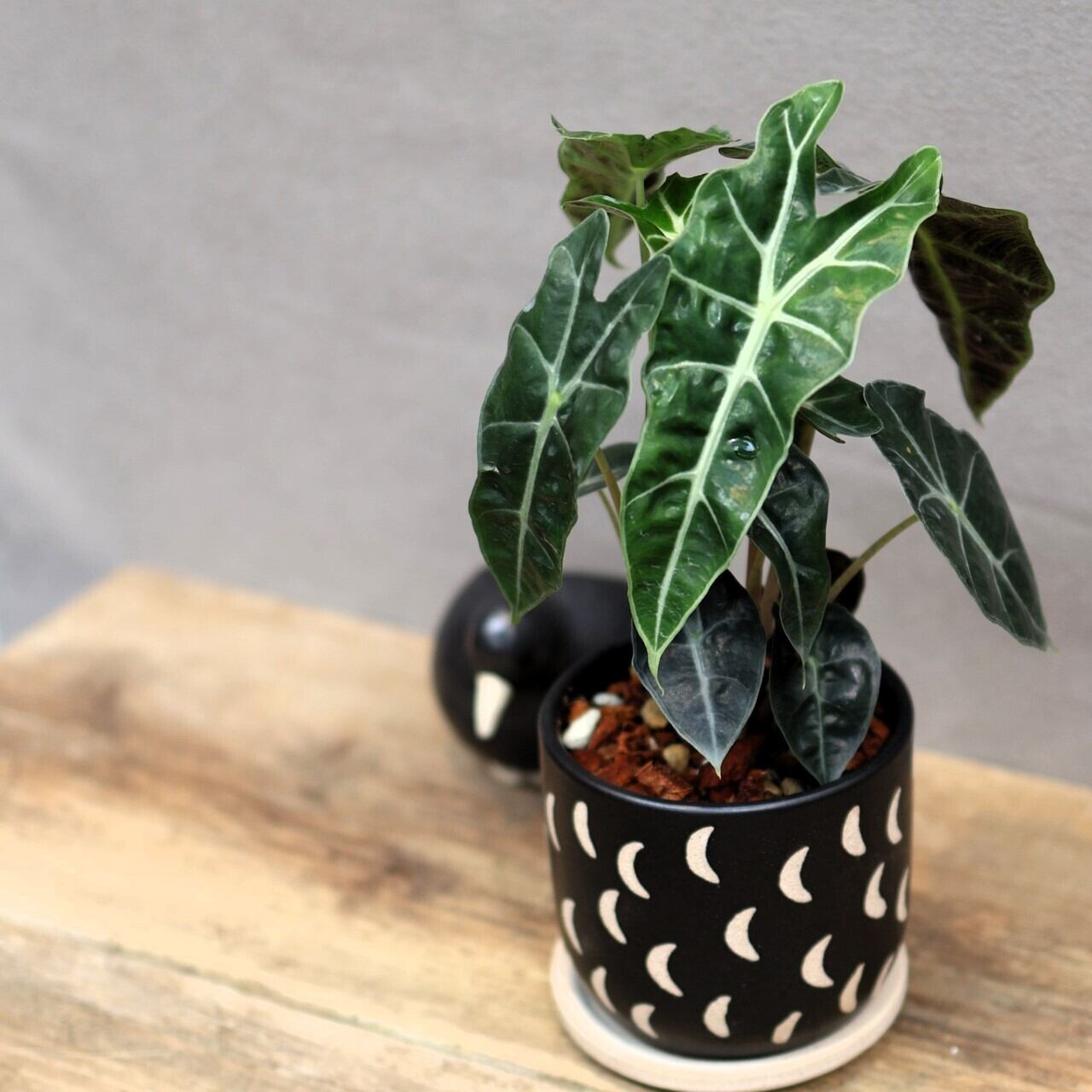 アロカシア アマゾニカは、ダークグリーンの大きな葉に白い葉脈が鮮やかに際立つエキゾチックな観葉植物です。葉は矢じり形で、光沢があり、縁が波打つのが特徴です。