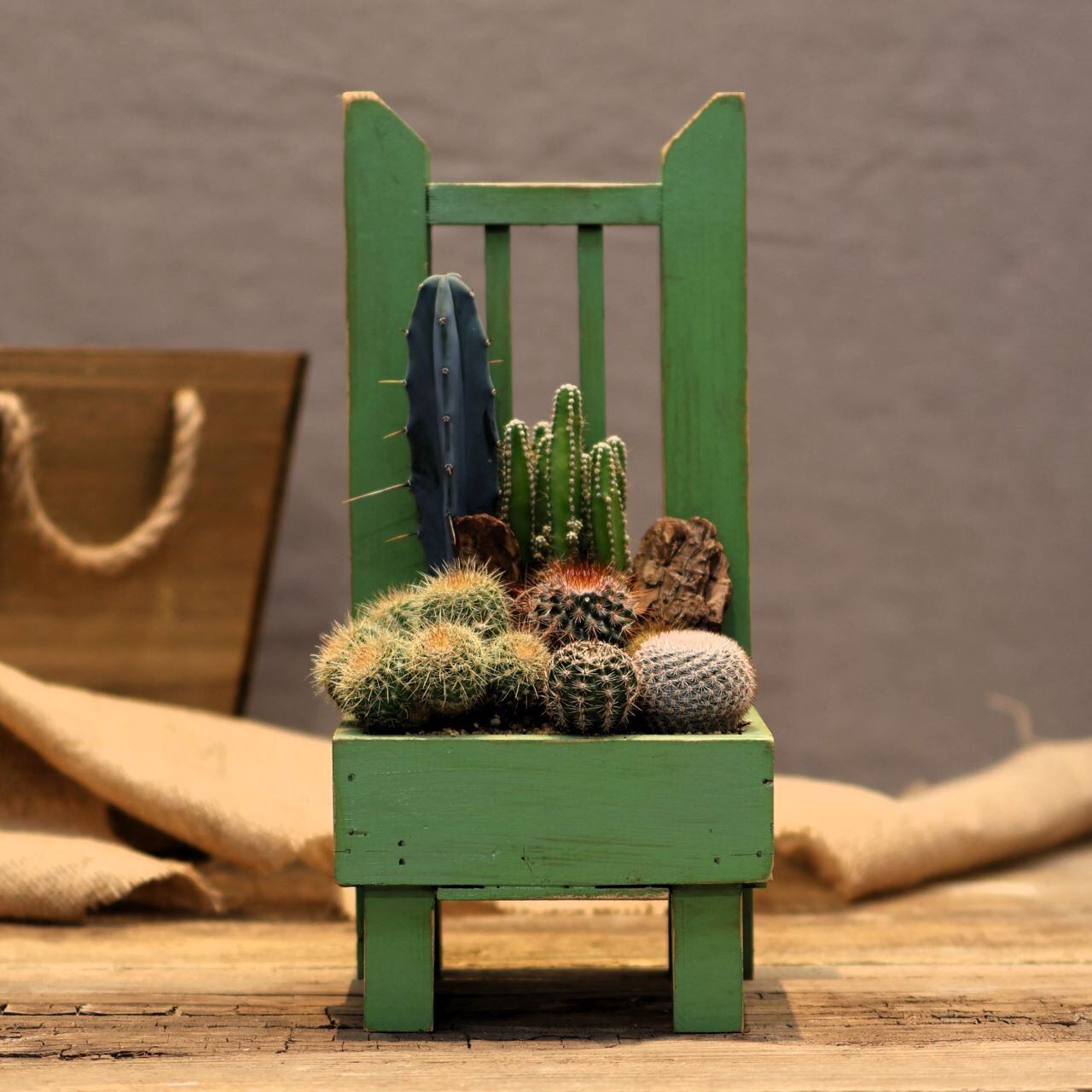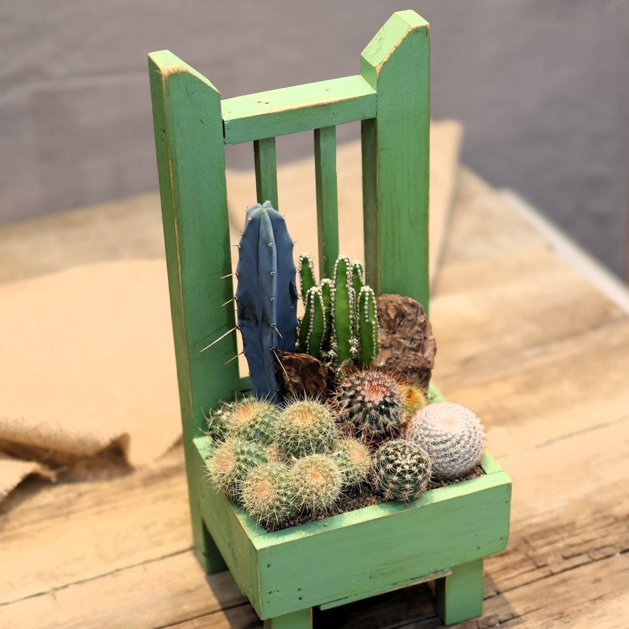 『サボテンの木製椅子寄せ植え 緑色』そのまま飾れる_多肉植物【送料無料】