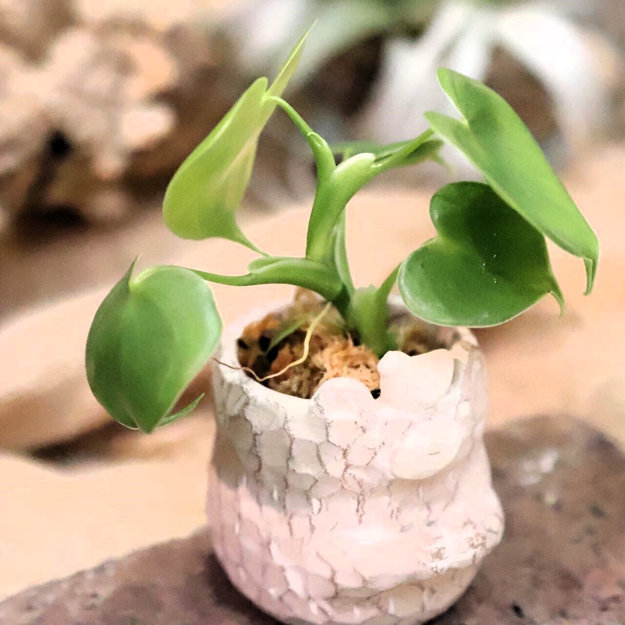 春から秋にかけては、水苔が乾き始めたら水やりを行い、冬は水やりを控えめにし、やや乾燥気味に育てることで植物の健康を保つことができます。自宅に『ハートフィロデンドロン クマ鉢白』を取り入れて、特別な穏やかな時間を楽しんでみませんか!