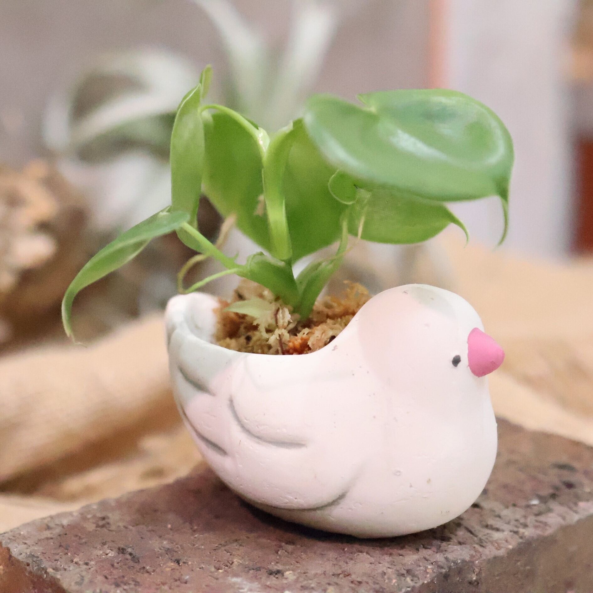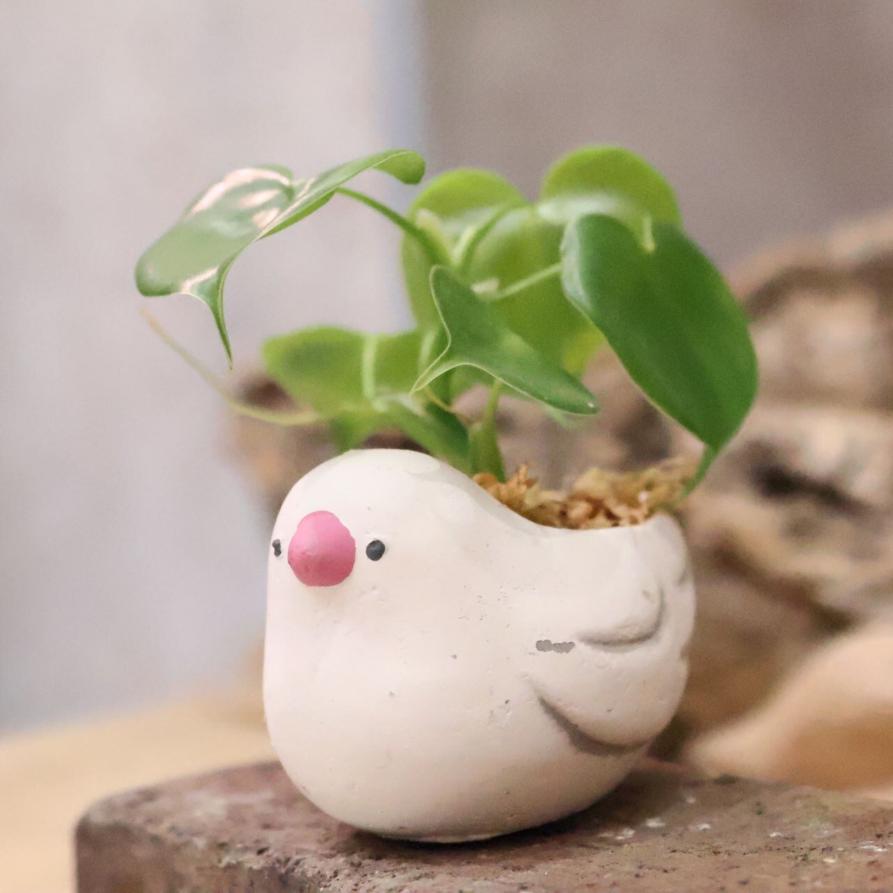 こちらの商品は、愛くるしい鳥のデザインの鉢に植えられており、テーブルに置くだけで魅力が引き立ちます。見るたびに心を和ませる素敵な存在となることでしょう!
