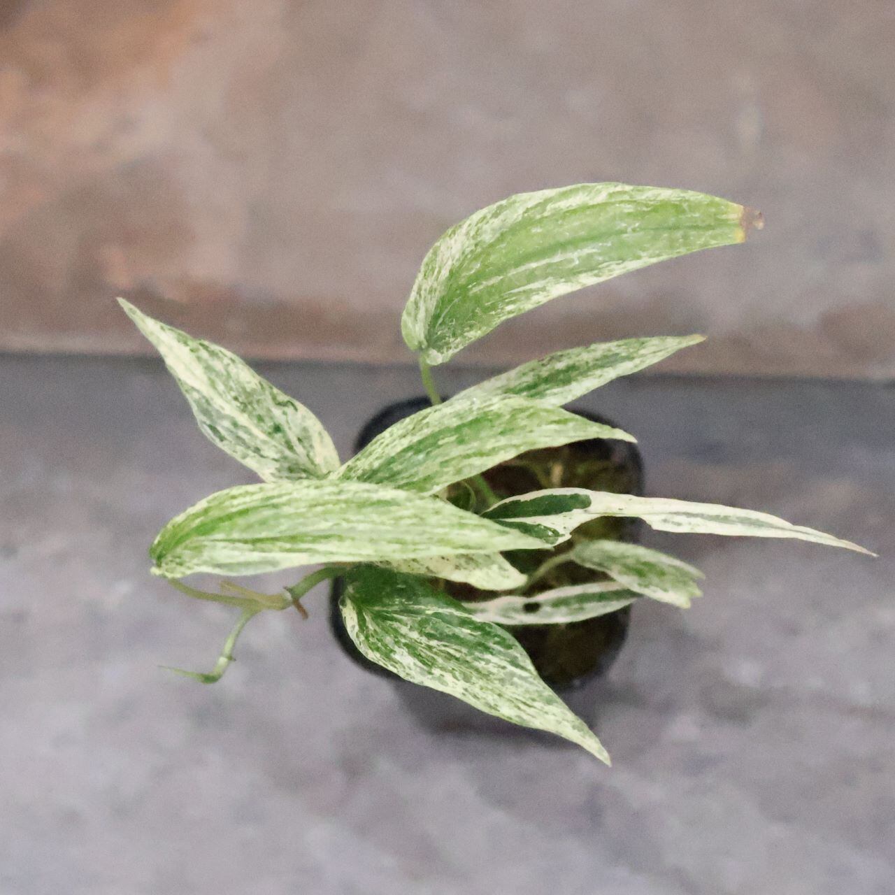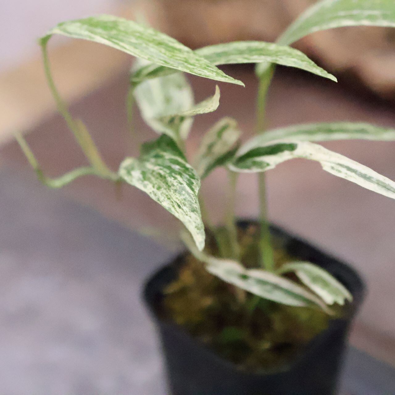 凸凹したポトスを細くした形の葉や切れ込みが入った葉が混じっていたりな 珍しい斑入りの葉が魅力的な観葉植物です!
