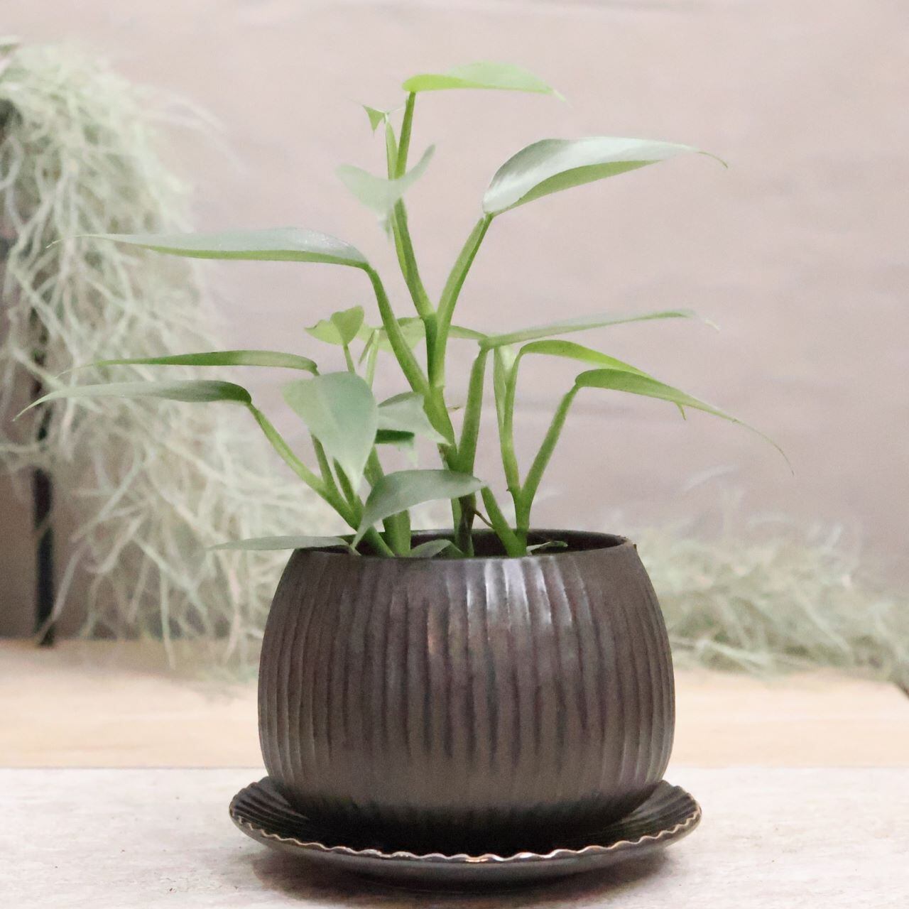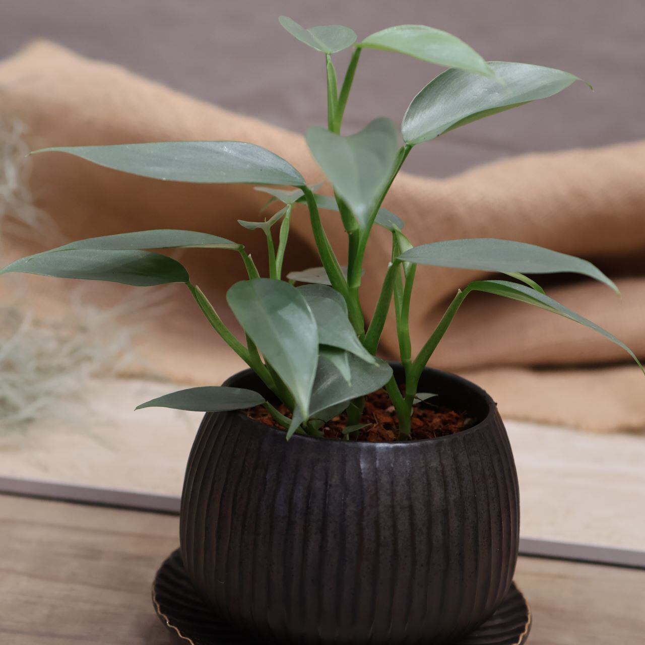 黒いシンプルで格好いい陶器の鉢に植えられて鉢皿もついていますので、お部屋にすぐ飾っていただけます。