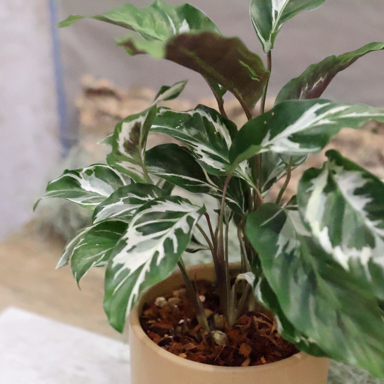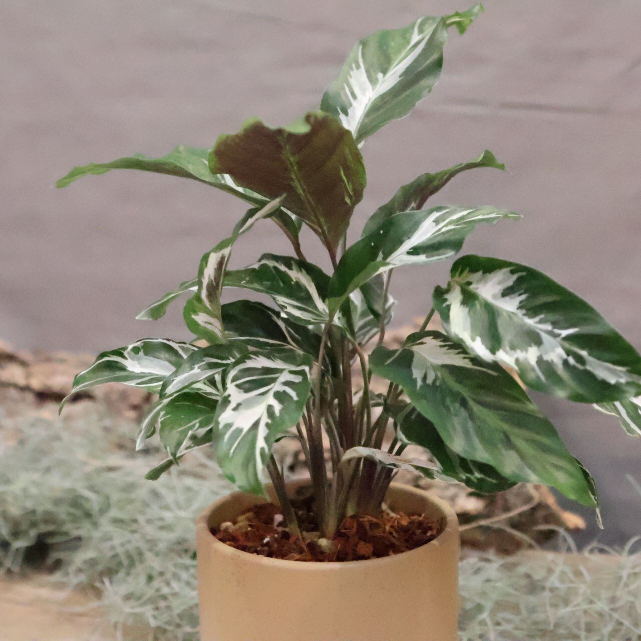 『カラテア ホワイトフュージョン』は、水彩画で描いたような美しさで目を引く白い葉脈と緑色のコントラストが美しい人気の観葉植物です。