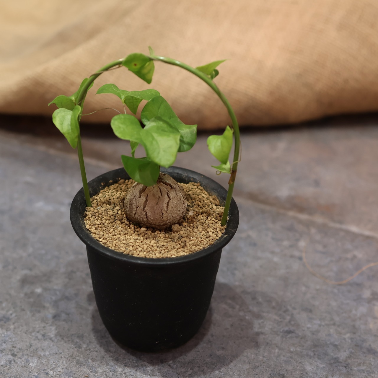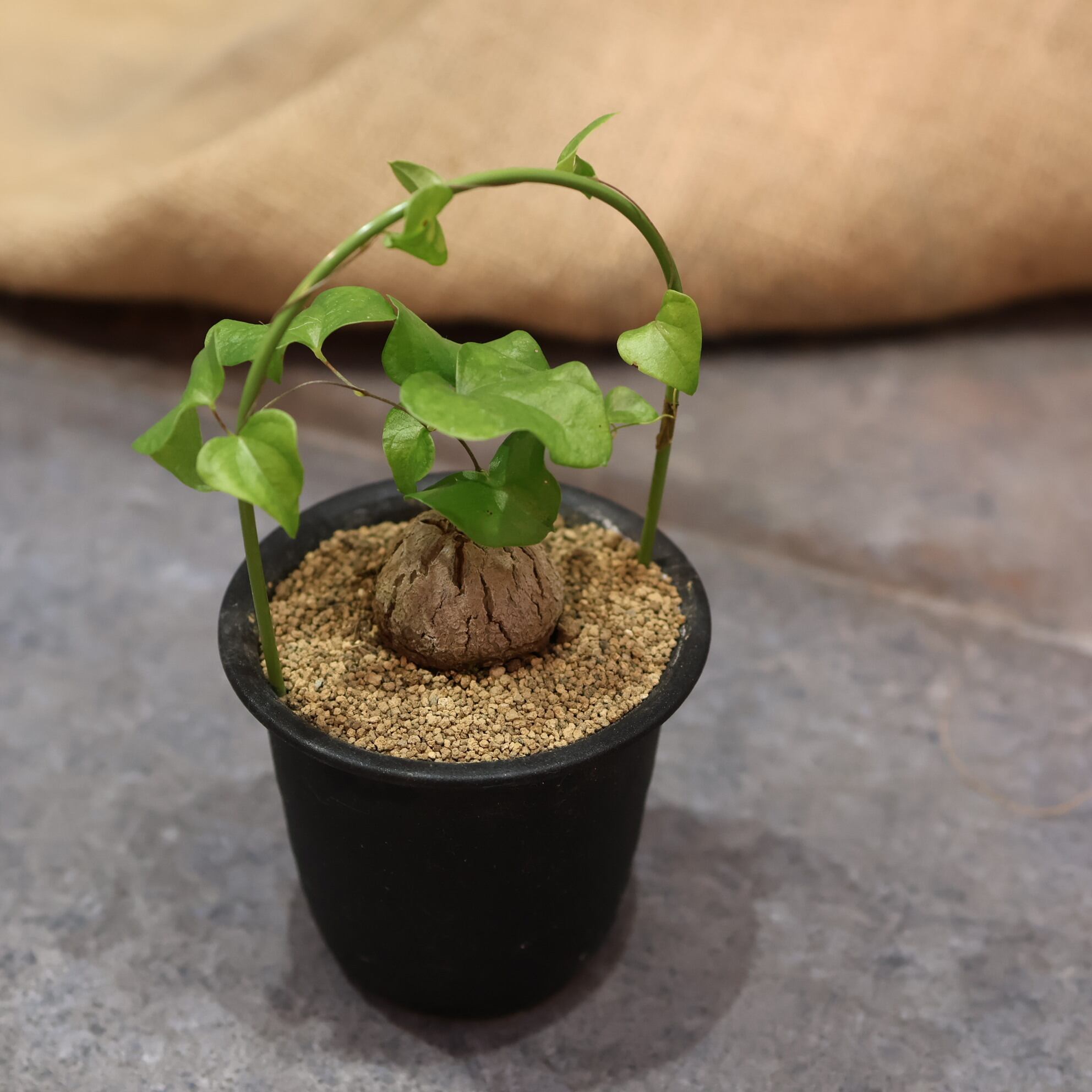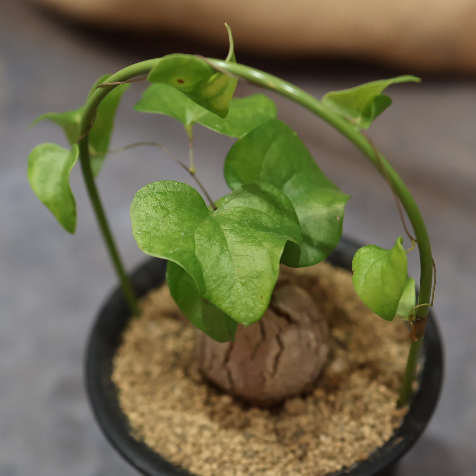冬型なので、9月上旬から5月中旬が成長期です。夏の終わり頃からつるを伸ばして葉を展開し、冬と春を過ごした後、梅雨前につるや葉が枯れ、塊根のみとなります。