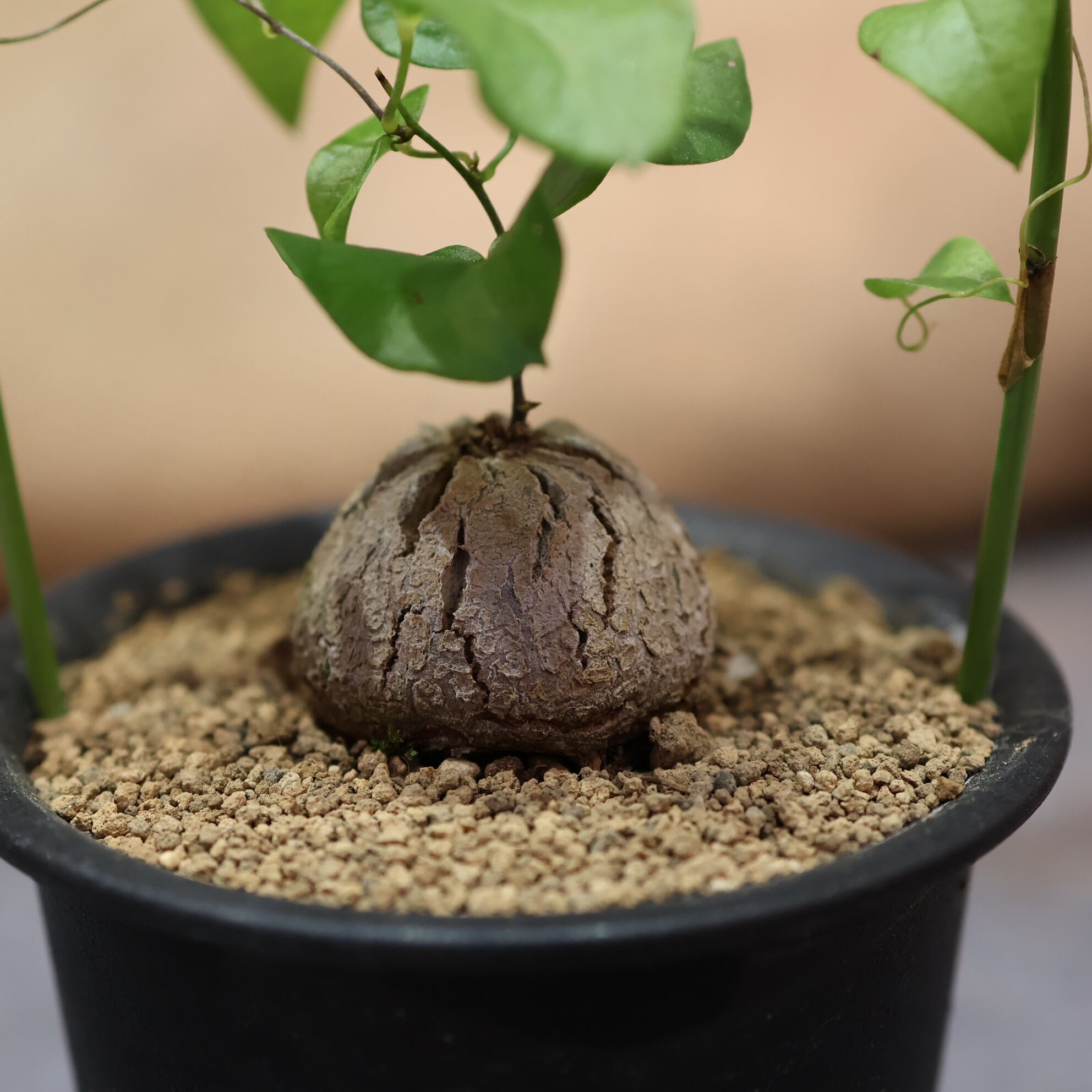 塊根部は直射日光に長時間当てると風化し表面が傷んでしまうので、葉にはしっかり日を当て、塊根部は遮光気味にします。