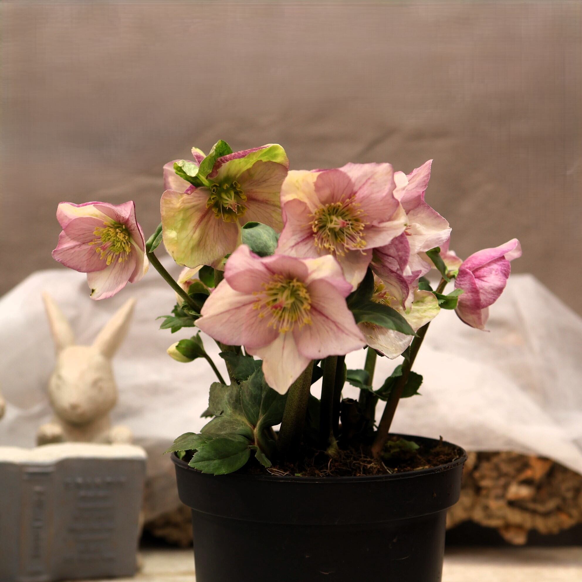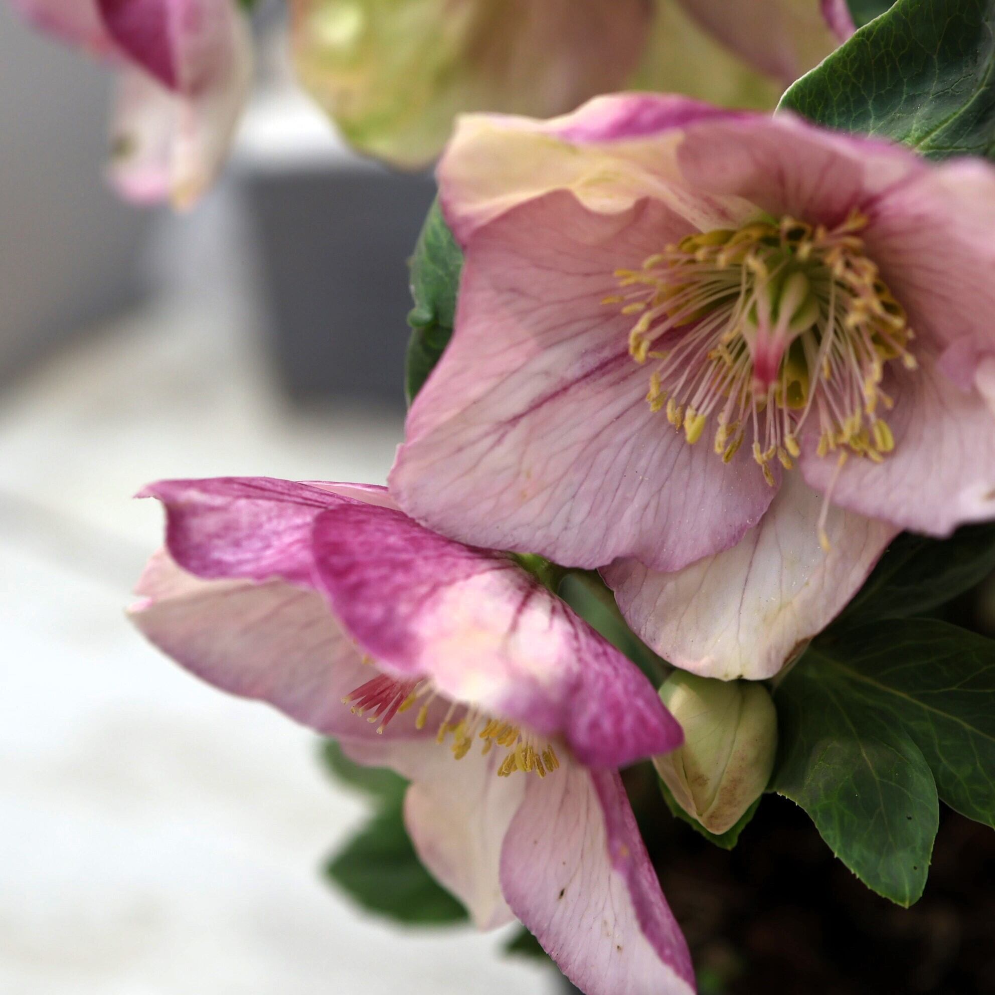 雪の妖精は、名花・マダムラモニエを引き継ぐ、鮮やかな色合いのハイブリッドニゲルです。ニゲル種の早生性と株立ちの草姿にガーデンハイブリッドの鮮やかさと強健さを持ち合わせた交配種です。氷の薔薇のように大きくならず、コンパクトで12月頃からと開花も早めです。