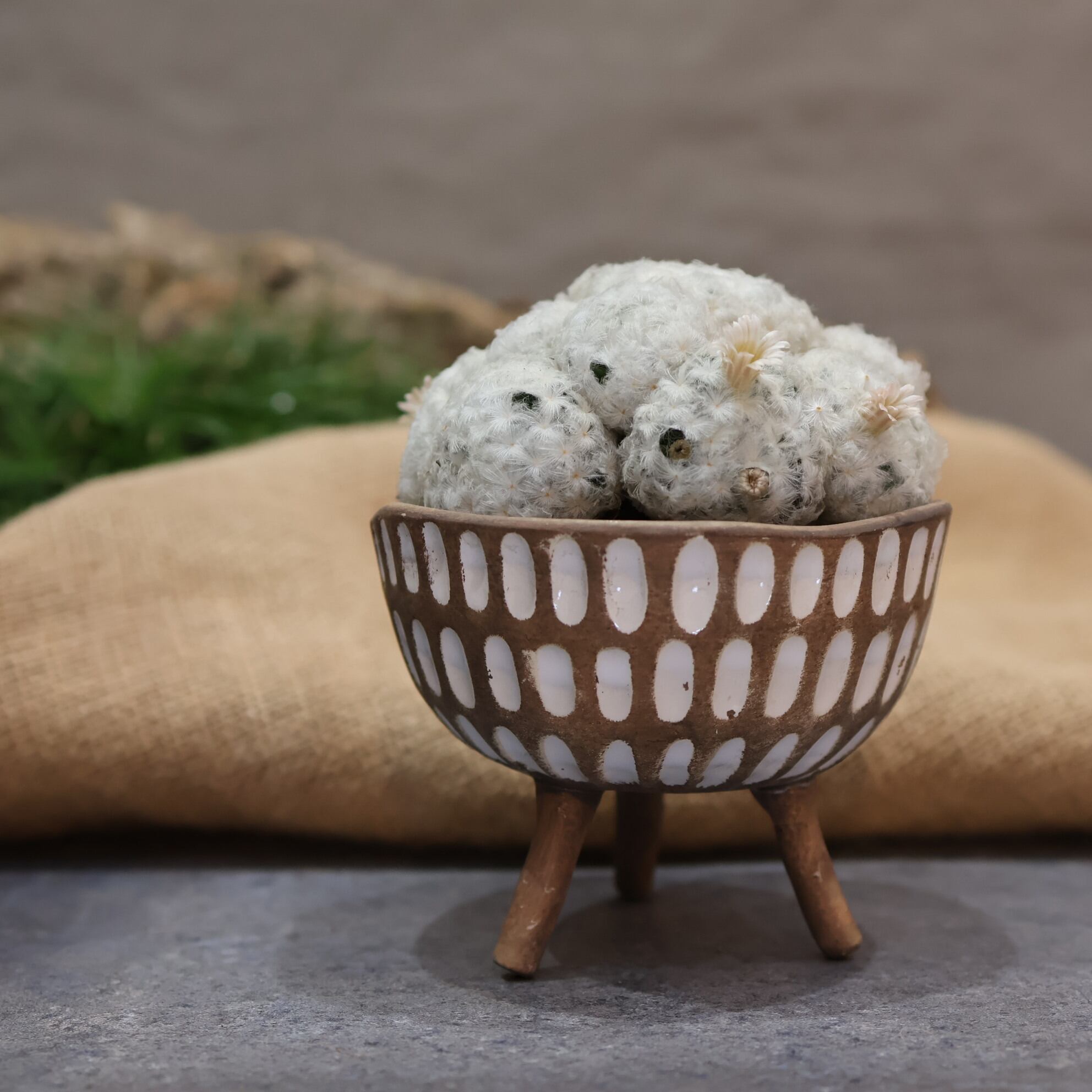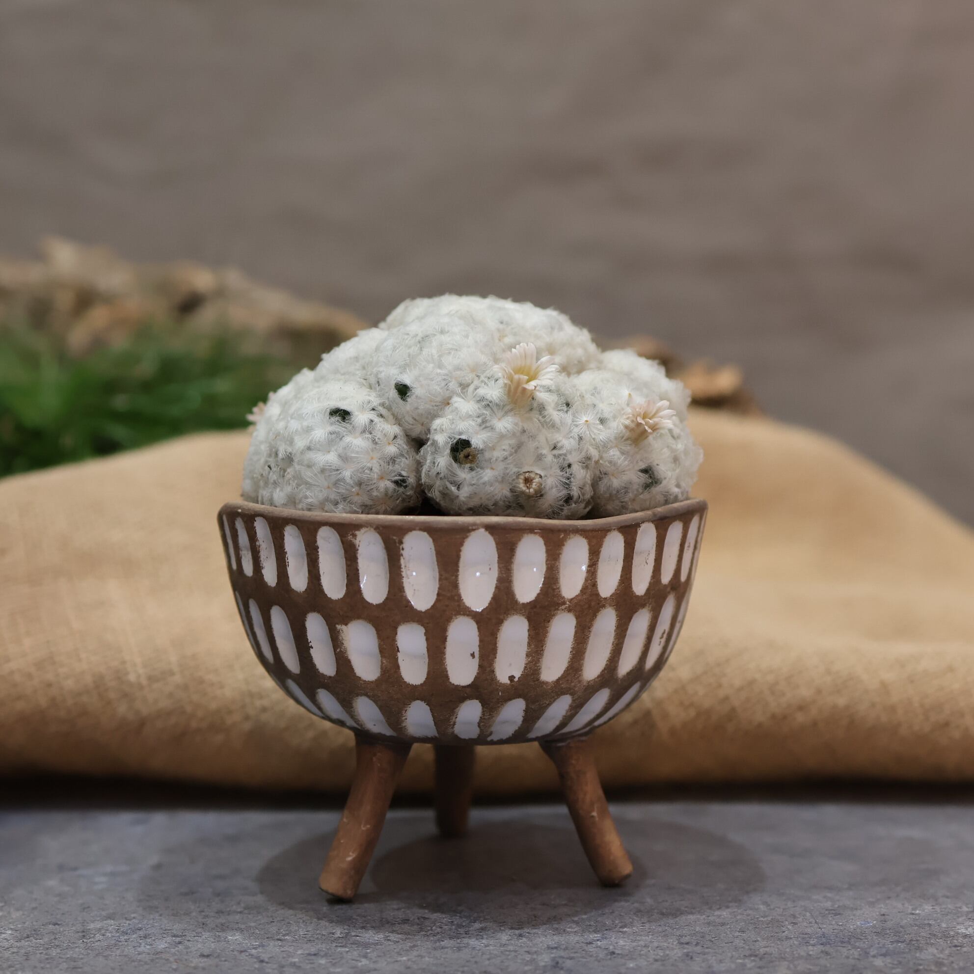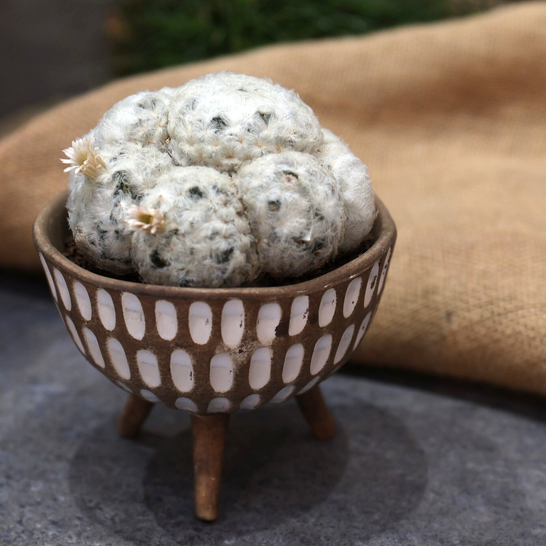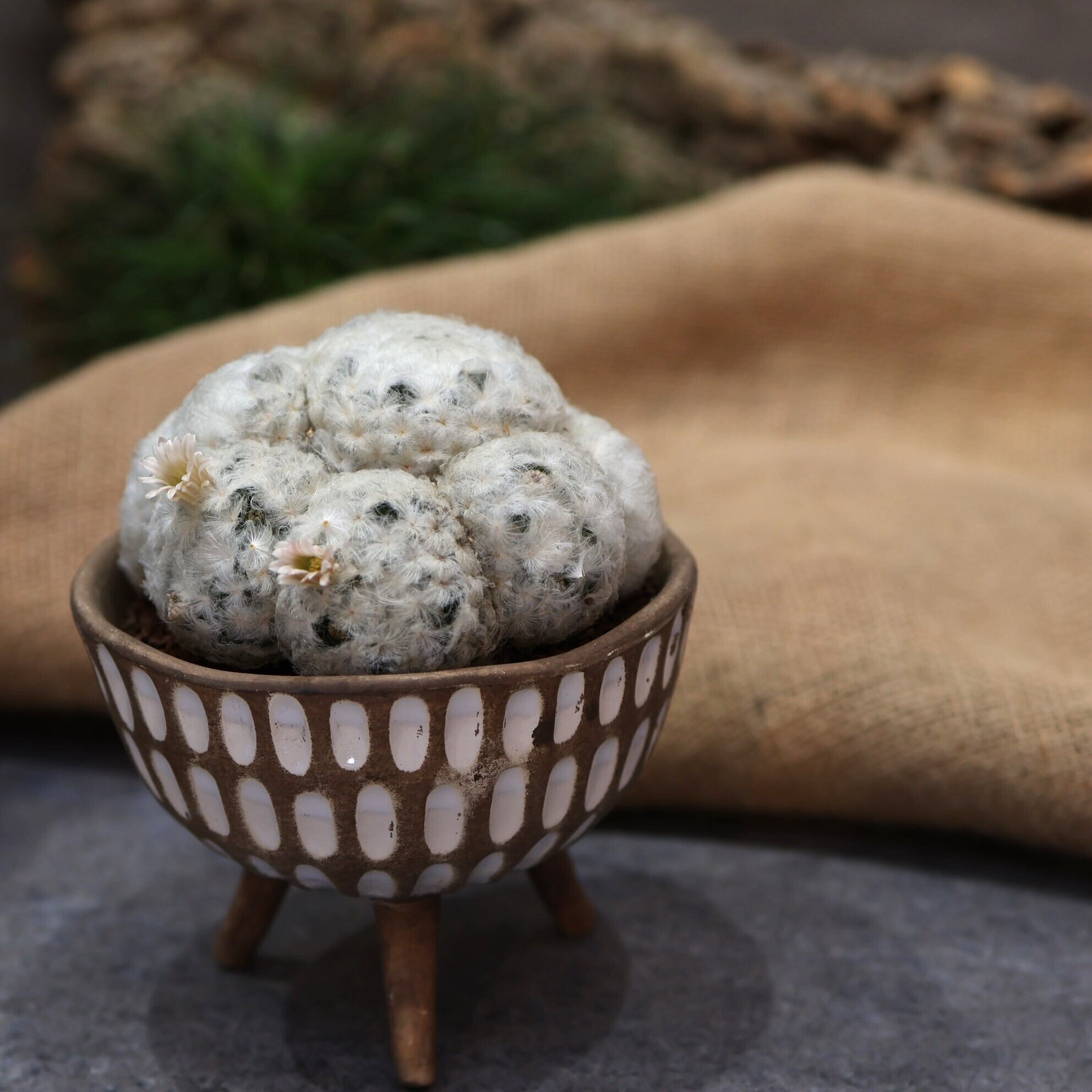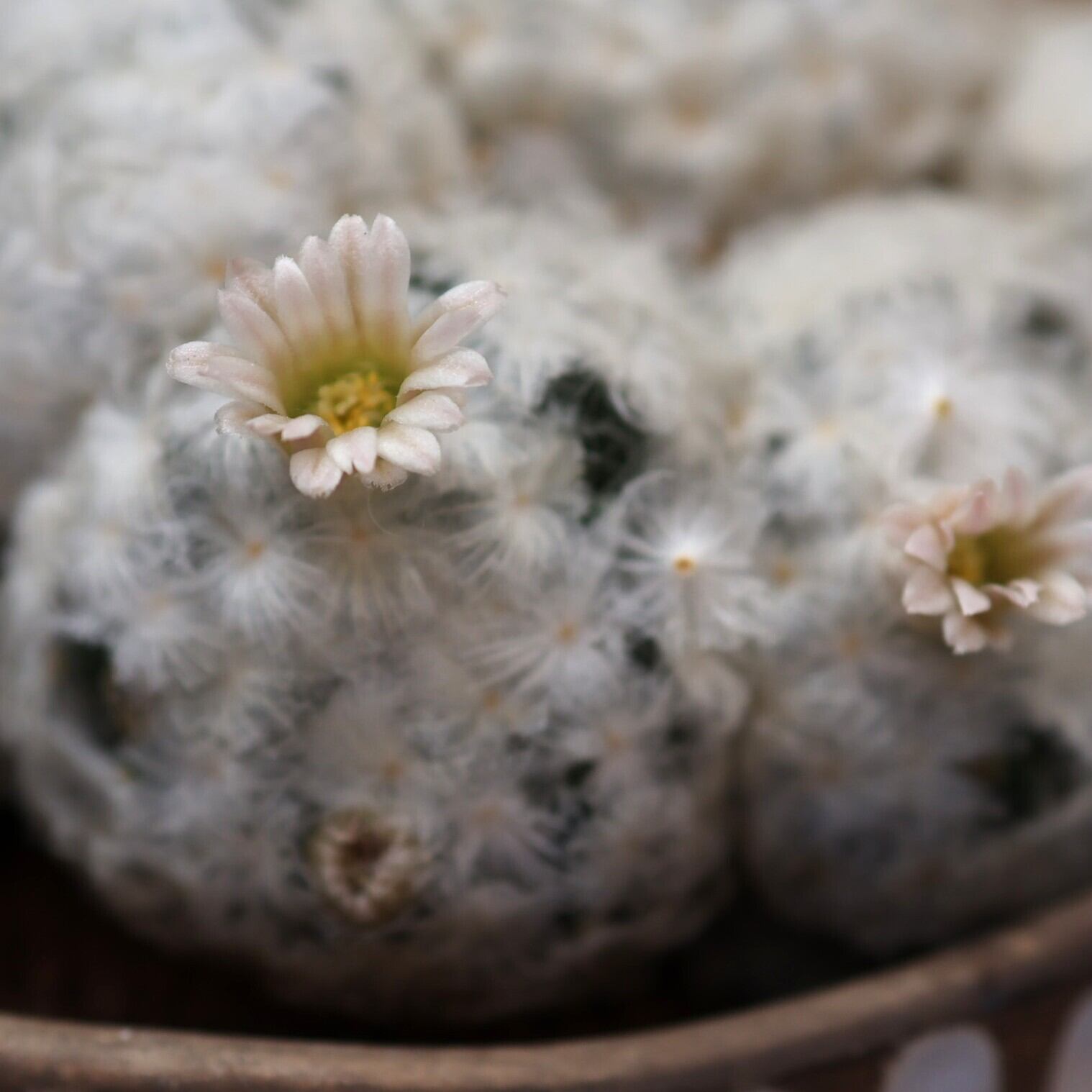 白くてふわふわした姿に思わず手が伸びる。。。『マミラリア白星』は、とげとげのサボテンはそれほど興味ないなぁ。。。という方でも気になっちゃう。もふもふの中からのぞかせるちっちゃいお花も可愛い♪そんな白星をご自宅に迎えてみませんか?