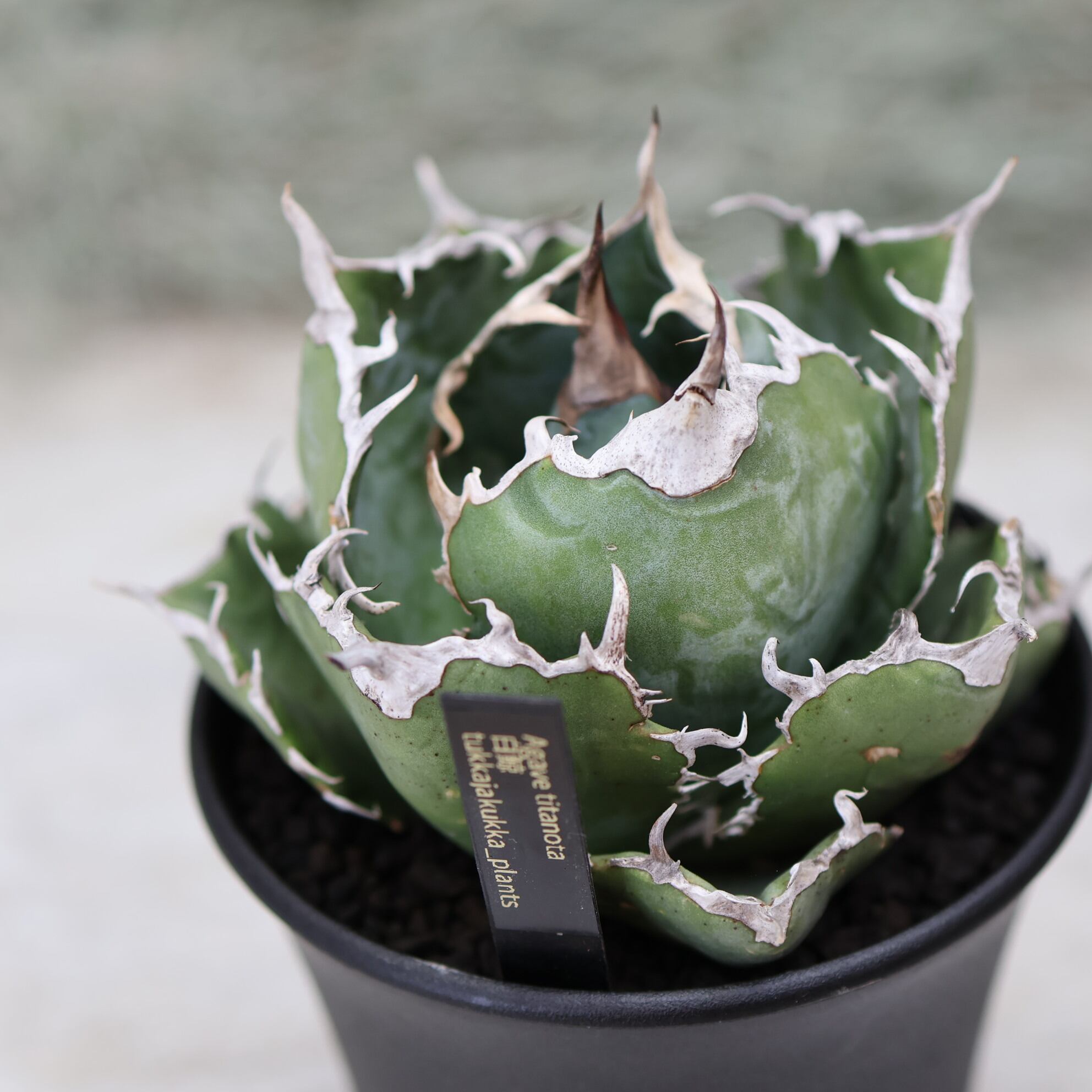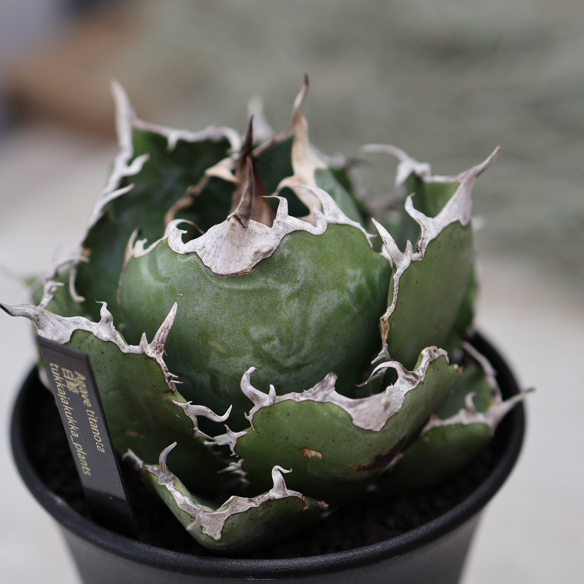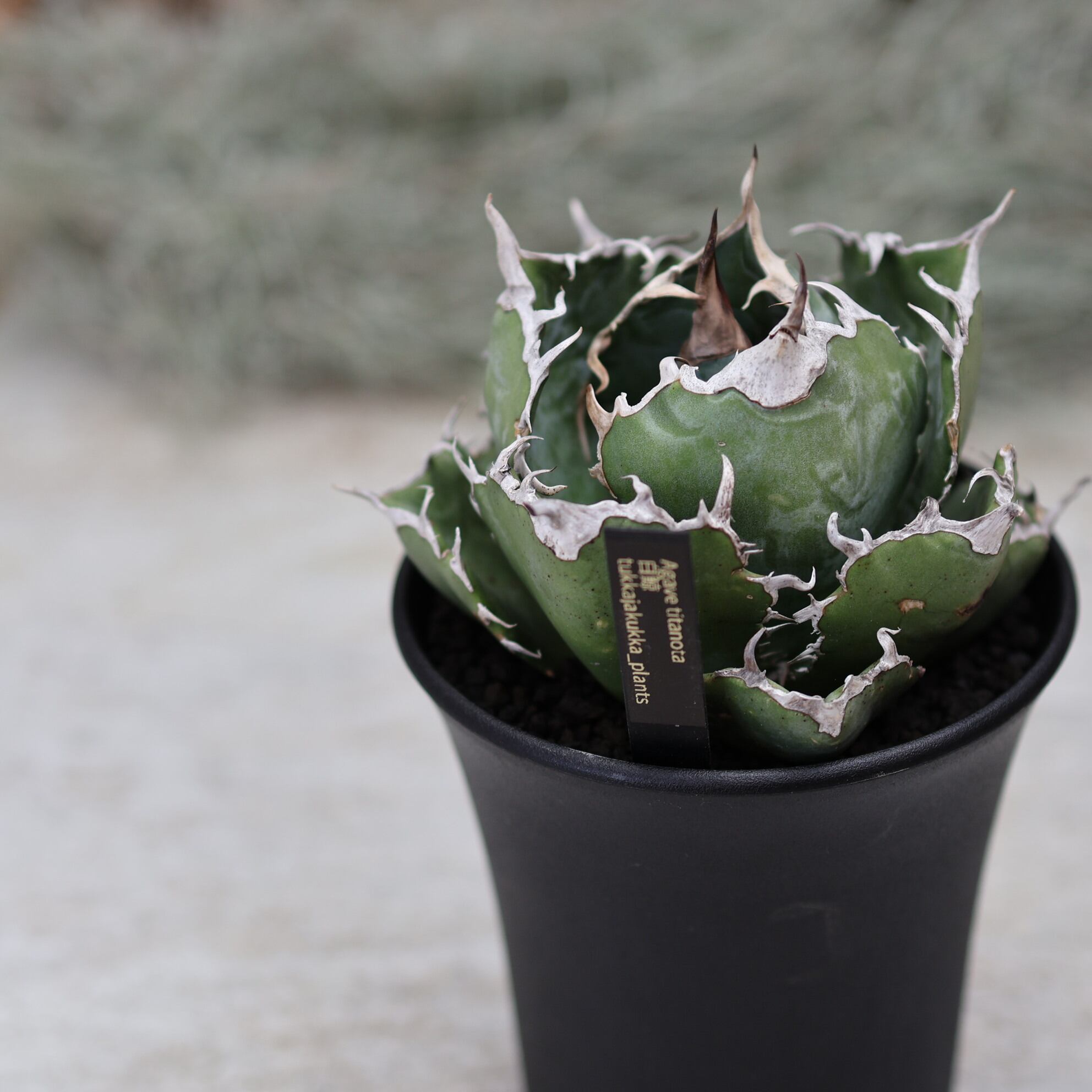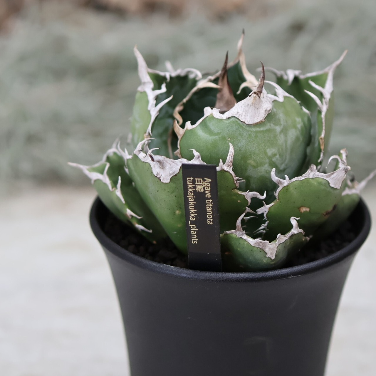 『アガベ 白鯨』は、幅広の葉と美しい白い鋸歯が特徴的な品種。成長するとボール状のフォルムになり、力強さと優雅さを兼ね備えた魅力的な姿を楽しめます。