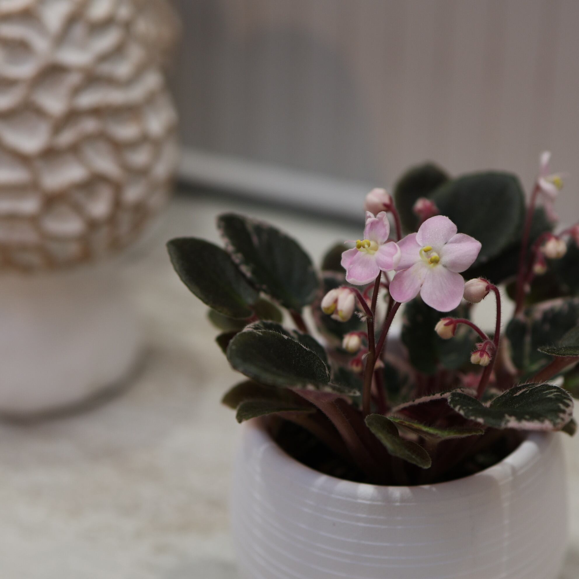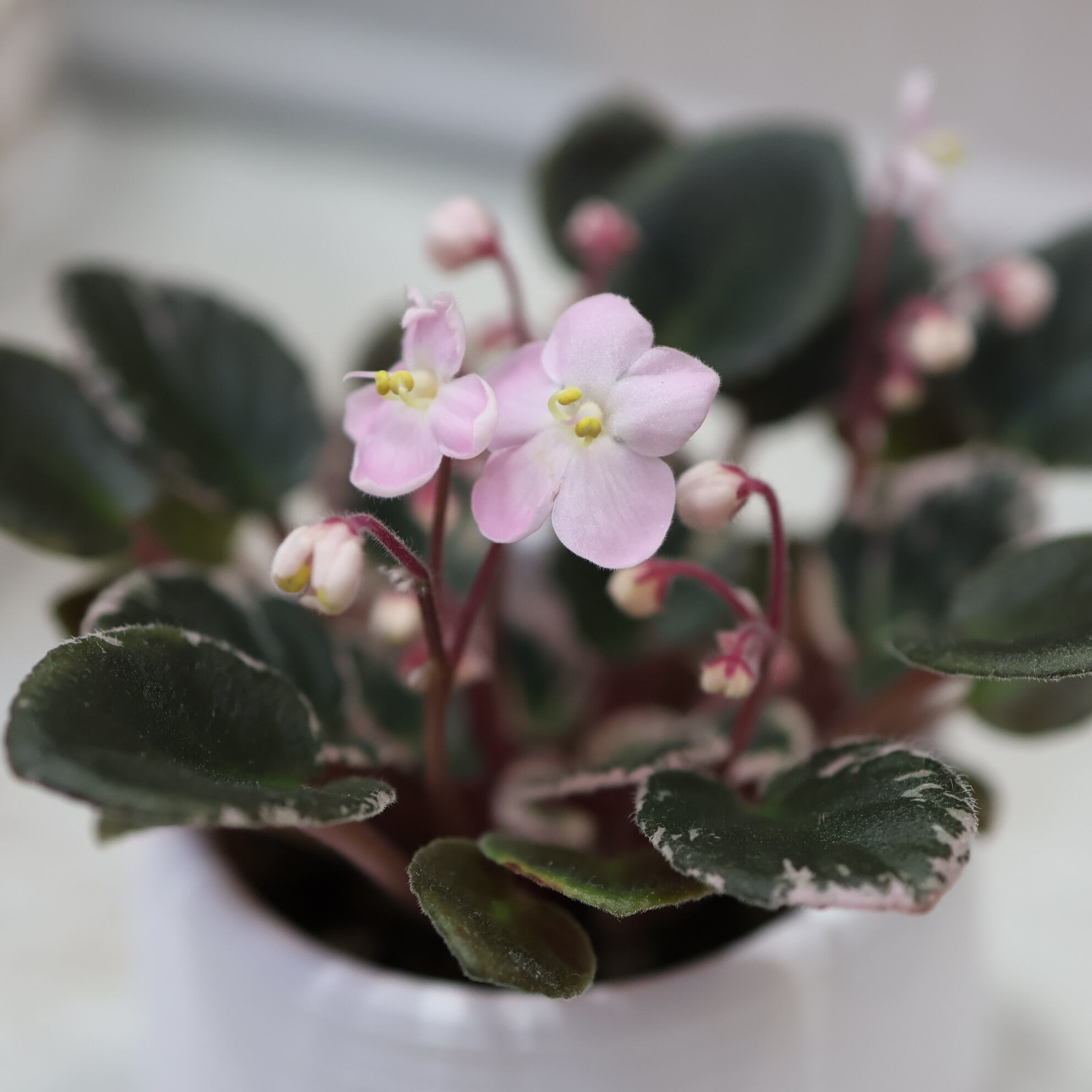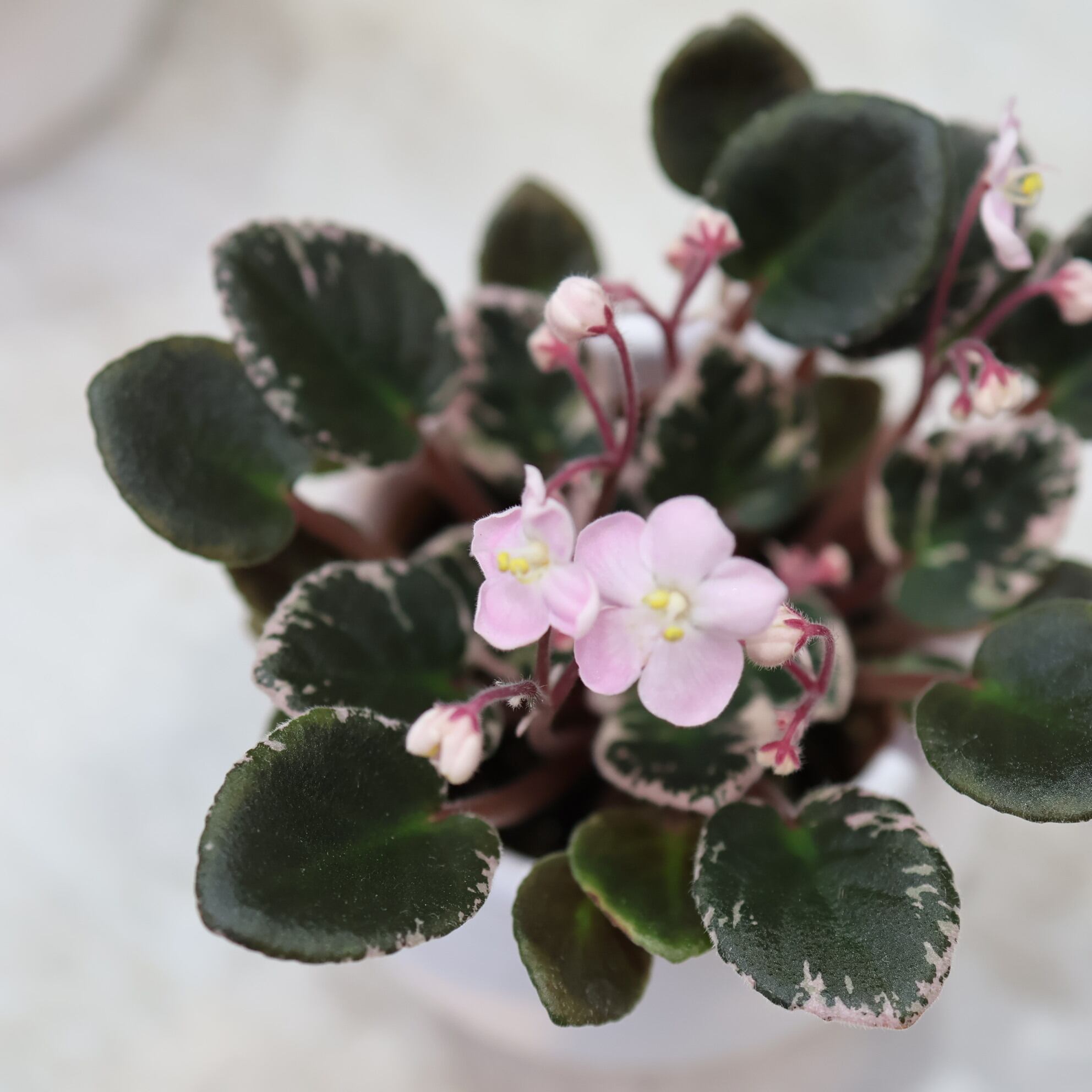 『ミニセントポーリア』は、手のひらサイズ。小さい株にいっぱいの花をつけます。珍しい斑入りの葉は肉厚でぷくぷく。産毛が生えてフワフワ可愛いです。小さいのでちょっとしたスペースでも楽しめます。